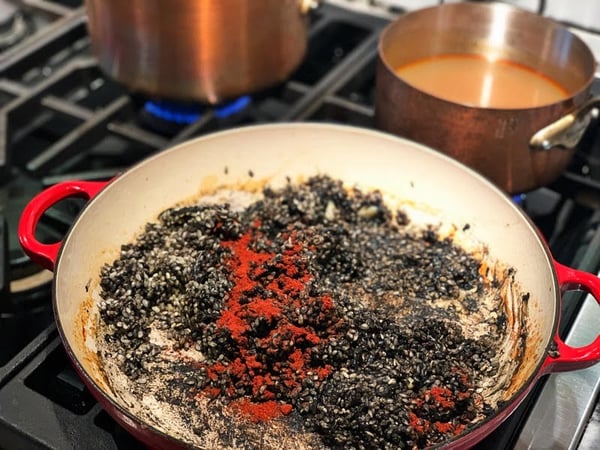 Heat a large, shallow pan over medium heat and sautée squid and shrimp until just cooked and set aside. If you’ve got a paella pan, use it! I’m doing mine in a Le Creuset braiser, but debated trying it in a very large copper sauté pan. My thought was that the thinner metal would approximate a paella pan and give me that delicious socarrat (the crunchy bottom) I was after. In the end... I chickened out as I was too worried about burning the rice before it got cooked. Next time though... I’m going to give it a try.