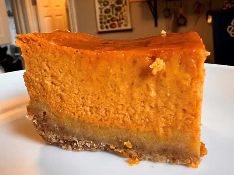 - While the crust is cooking, make the filling by whisking together the pumpkin, evaporated milk, maple syrup, spices, salt, and eggs until smooth.