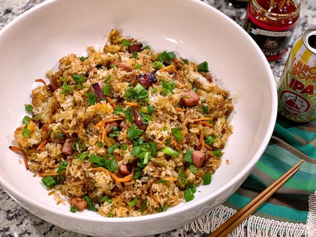 - 1-2 cups protein of your choice (I’m using Spam because Spam-fried rice is delicious, but you could use chicken, shrimp, ground beef, lamb or no meat at all.)