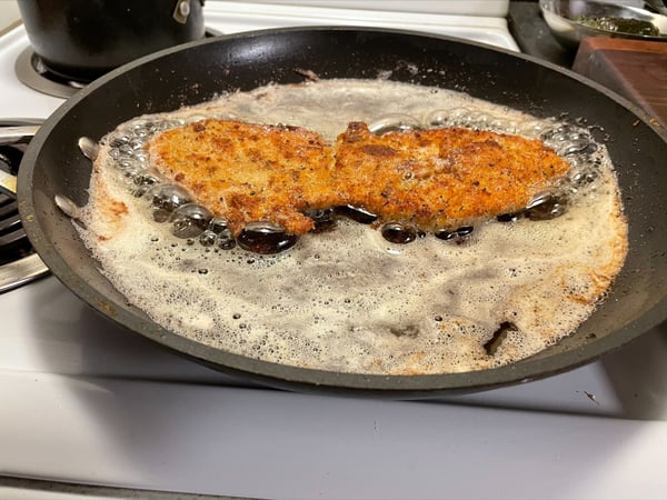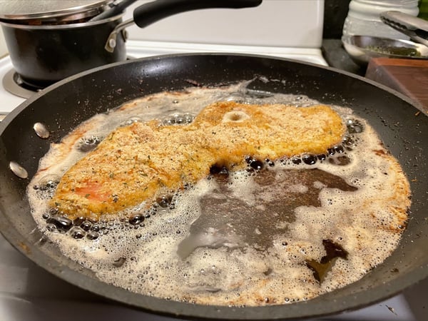 5. Gently place the breaded cutlets in the hot oil, and cook until golden brown and crisp on the first side. Flip and repeat.