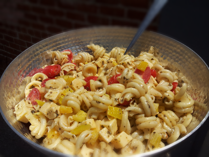 The end result was delicious: pasta salad with yellow bell peppers, cherry tomatoes, and smoked gouda tossed in a creamy pesto dressing. Some other standouts of the potluck include brisket, enchiladas with homemade tomatillo salsa, skillet pizza and another pasta salad. It’s possible that the other pasta salad was better than mine, too.
