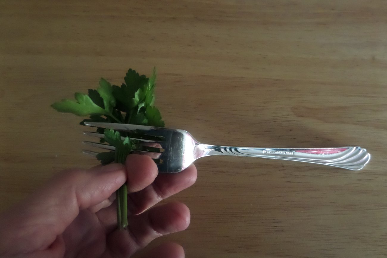 You simply take a bunch of parsley and hold it in your hand while taking a fork in your other hand, with the tines facing upward, and scrape the leaves off the stems. Fantastic! What a great tip.