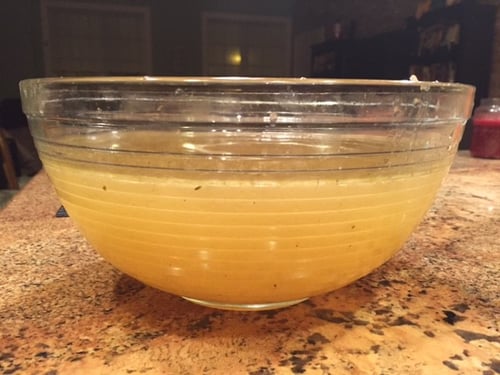 5. Turn the heat off and carefully remove the carcass from the pot and strain the stock through a sieve to catch any impurities, meat, vegetables, etc. Keep the meat for later. The stock will have a rich yellow color.
