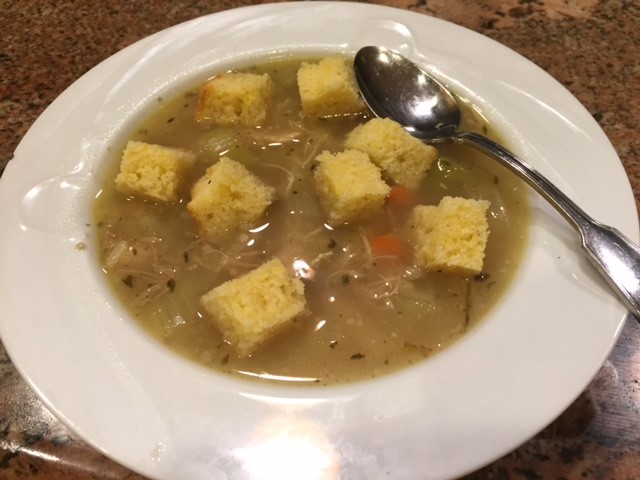 10. Serve up a big bowl of your homemade turkey soup and garnish with crackers, or in this case, I made some cornbread croutons by throwing some cornbread (drizzled with melted butter) from Thanksgiving into the oven.
