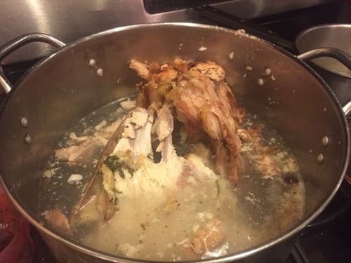 2. Grab a stock pot (or a pot large enough pot to fit the turkey carcass) and put the carcass in the pot (you can break it up if you need to). If you haven’t eaten or thrown away the turkey neck, you can add that in too! Fill the pot with just enough cold water to cover the carcass (probably 2-3 gallons depending on the size of your pot and the size of your turkey).