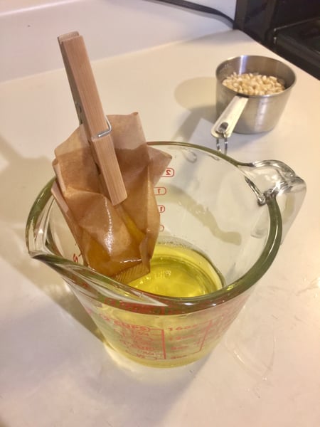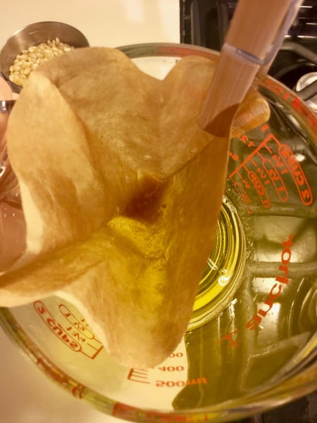 Now, strain the butter to be sure none of the milk solids make it into your popcorn. You can use cheesecloth or a coffee filter.