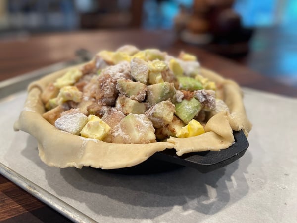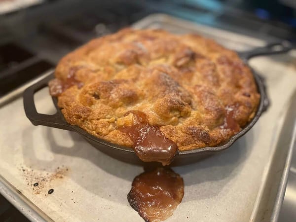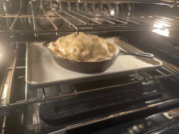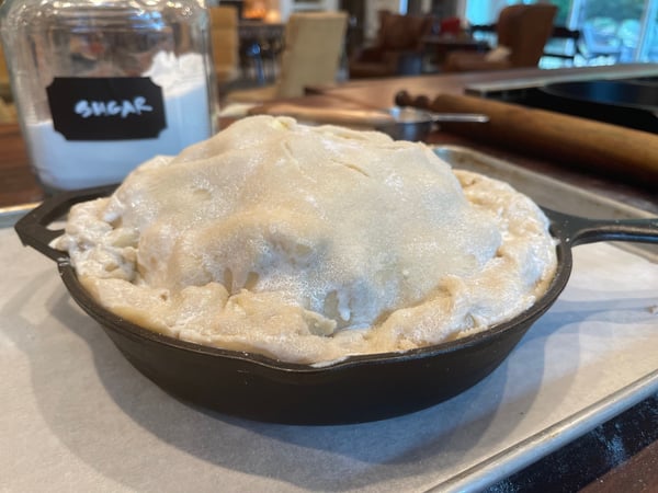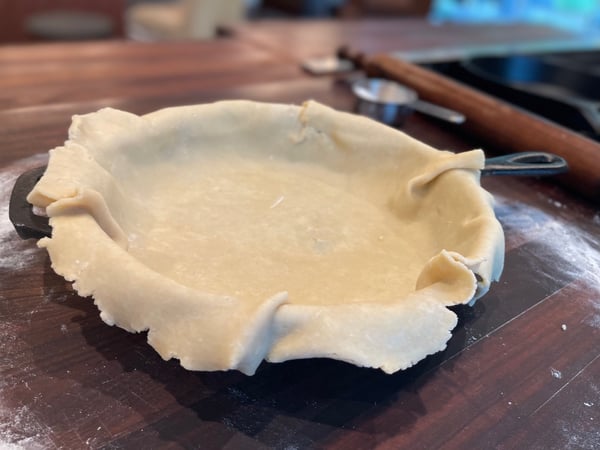 - Gently roll the dough onto the rolling pin, lift, and place into a 9- or 10-inch pie dish or seasoned cast iron skillet. Gently push the dough to fit the pie dish, allowing excess to hang over the edge.
