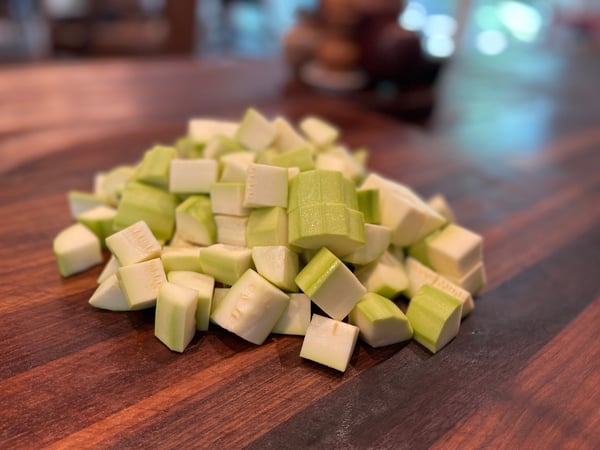 2. Dice into one inch cubes. If there are large seeds (like the size of a cucumber seed), remove those seeds.