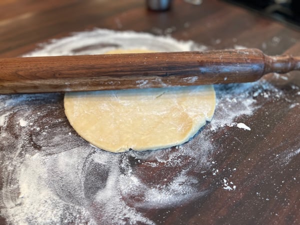 4. Lightly dust a clean surface with flour and roll out one disk of dough into a 1/8-inch-thick circle. Tip: As you’re rolling, lift and turn the dough occasionally to ensure it does not stick.