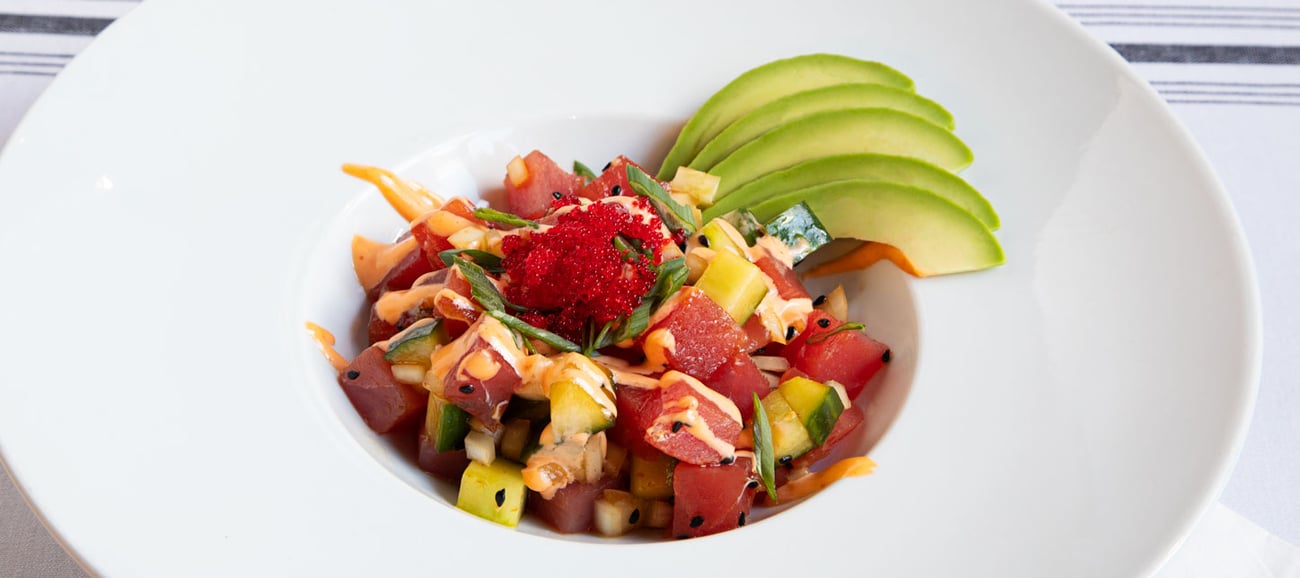 Ahi Tuna Poke with Cucumber, Avocado and Spicy Tobiko Mayo