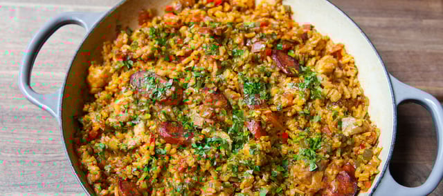 Paella is a sunny, fluffy yellow rice dish from Spain and can be loaded with everything from seafood to chorizo.