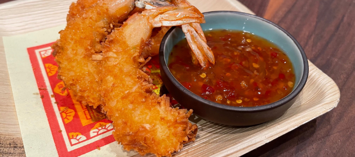 First, dredge the shrimp in the flour, shaking off any excess. Dip into the batter and then coat in the shredded coconut.