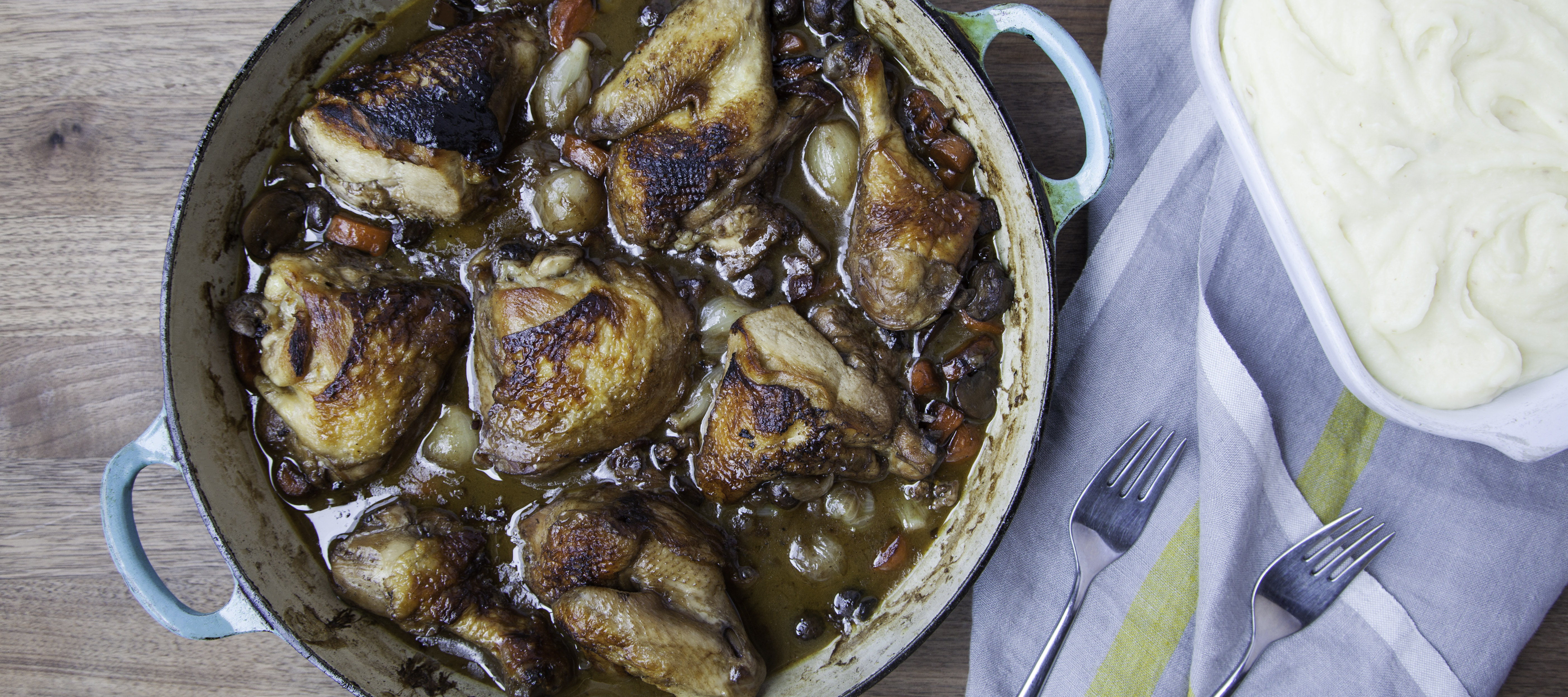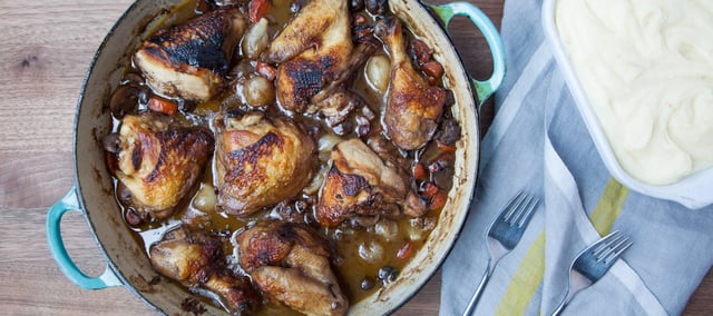 Return the dark meat and wings to the pan along with the wine, stock and herbs de Provence. Season with salt and pepper.