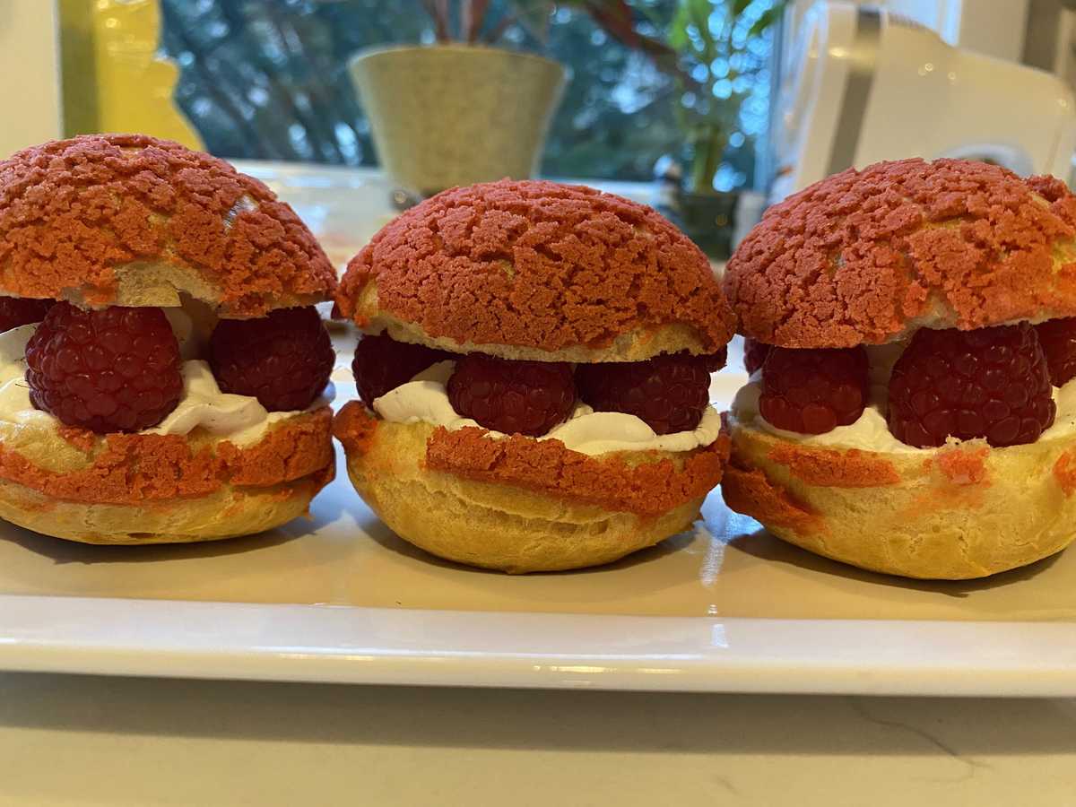 - Slice each puff in half horizontally with a serrated knife. Fill the bottom each puff with a swirl of whipped cream and raspberries and then replace the top. Serve immediately after filling.