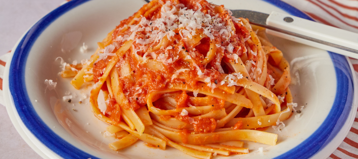 - Toss with the cooked fettuccine and top with grated parmesan.