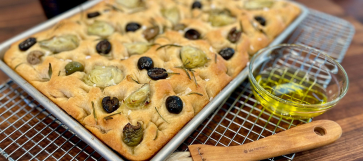 - Transfer the focaccia dough to the sheet tray and use your fingertips to gently stretch the dough until it is an even thickness and fills the pan.