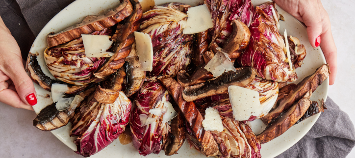 - Place the grilled radicchio on a platter. Cut the mushrooms into strips and place on the platter.