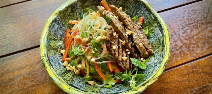 Place the grilled steak in the bowl with the noodle salad. Toss well, top with the peanuts and serve.