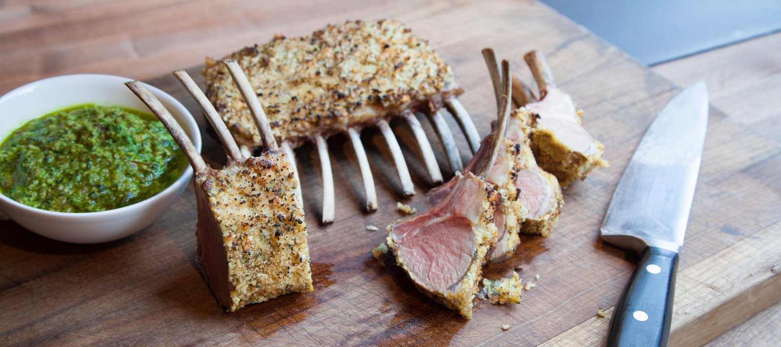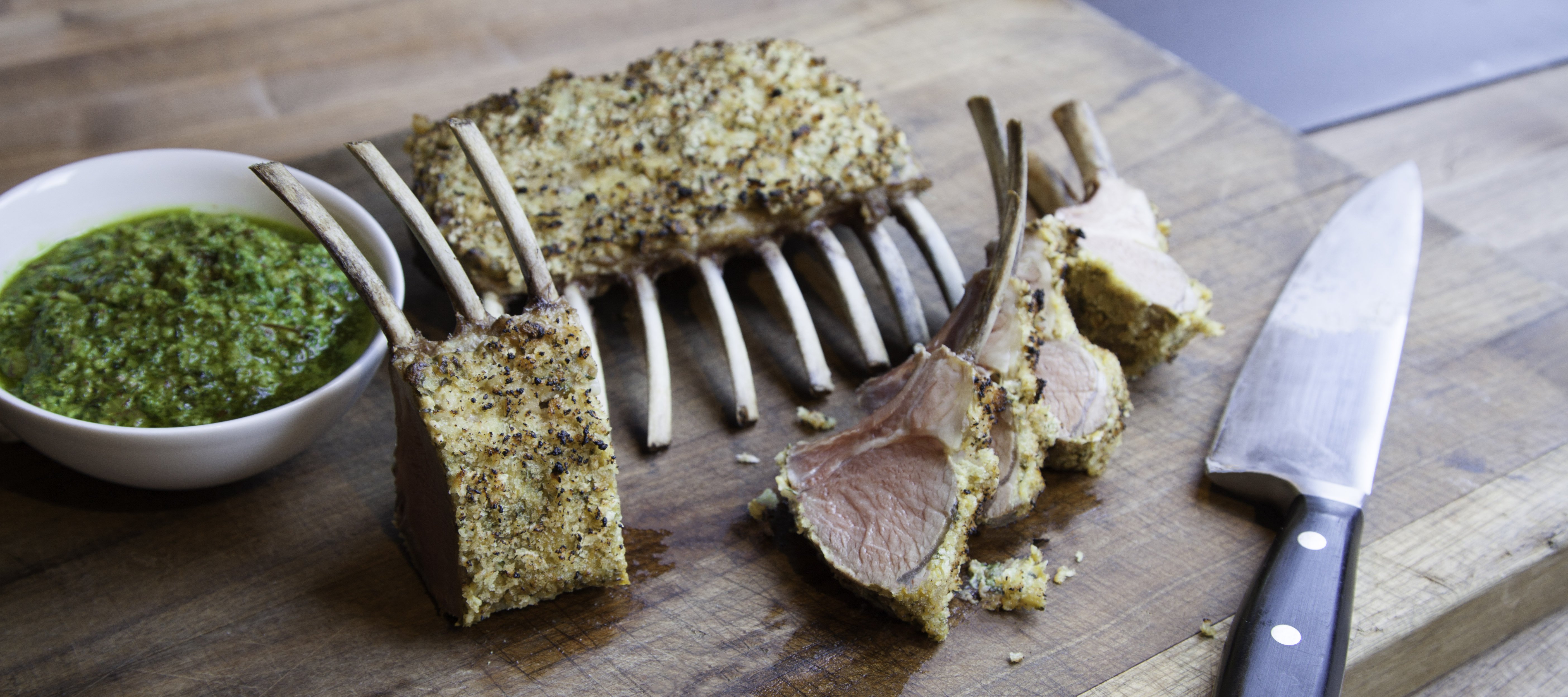 Herb Crumb-Crusted Rack of Lamb with Parsley-Mint Pesto
