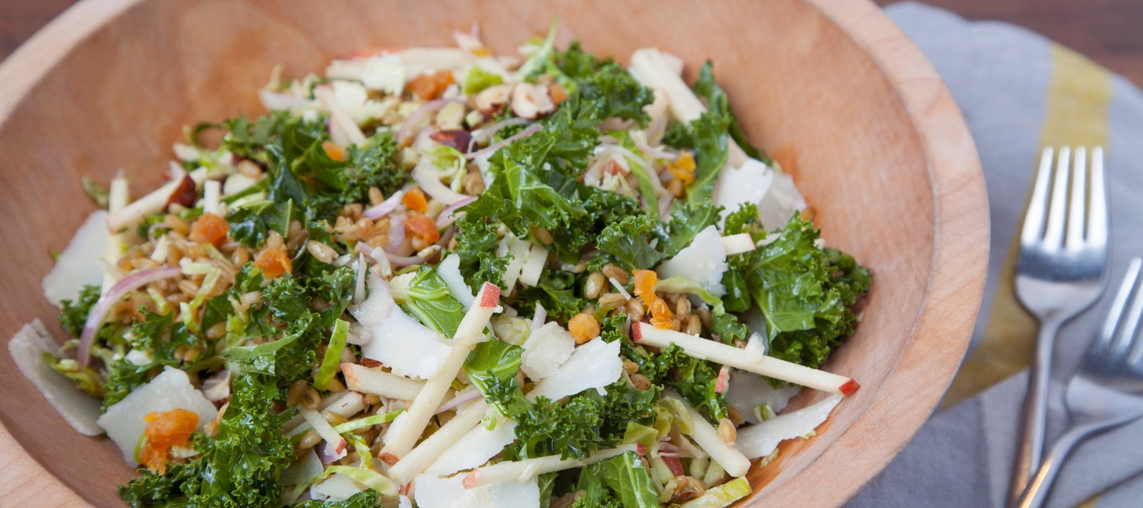 - In a medium-size salad bowl toss together the cooked freekeh, kale, brussels sprouts, apples and hazelnuts.