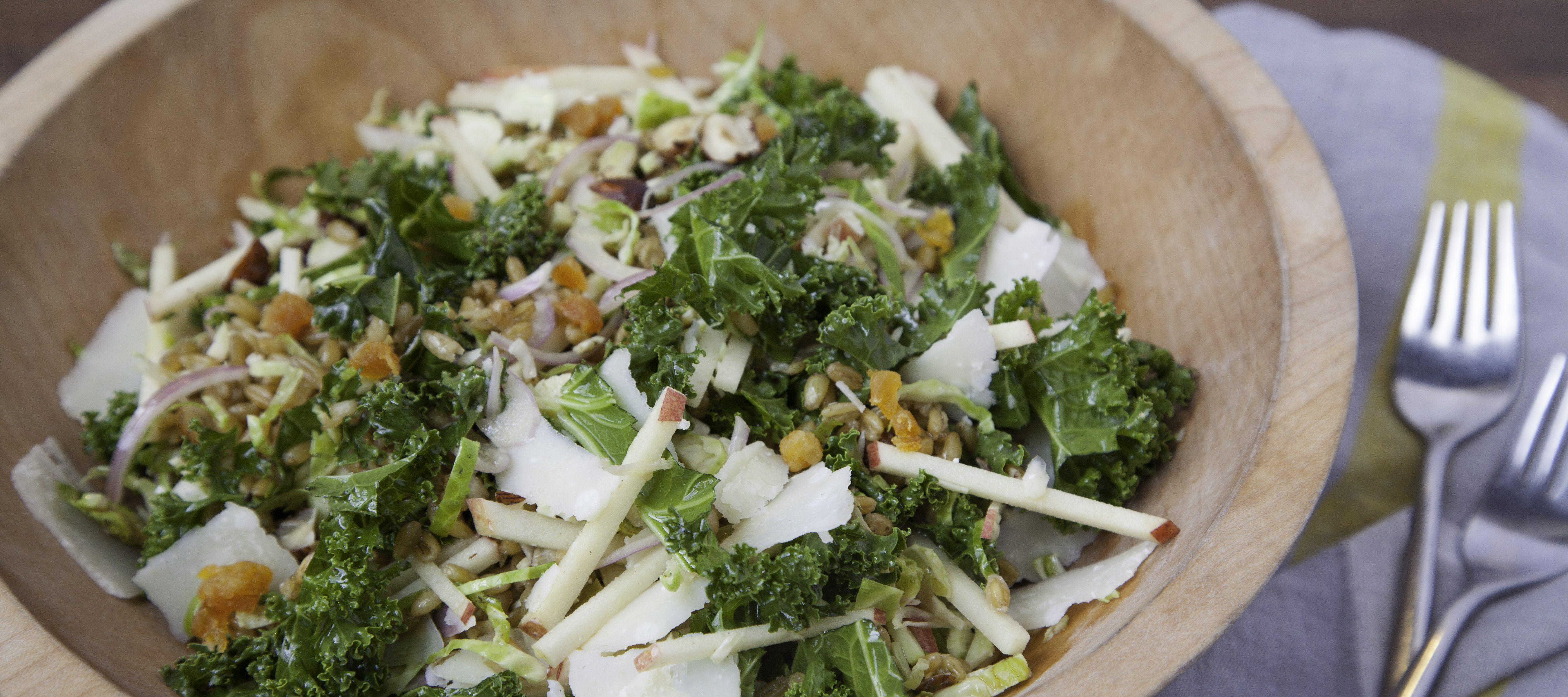 There is a lot to love about freekeh, an earthy grain that is similar to bulgur but has a more complex flavor. For this salad, we pair it with kale and Brussels sprouts.
