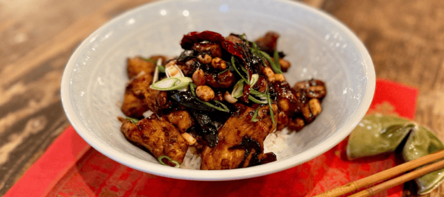 - Add the chilies, peanuts, garlic, scallion and ginger and cook, stirring, until aromatic, about 30 to 45 seconds.