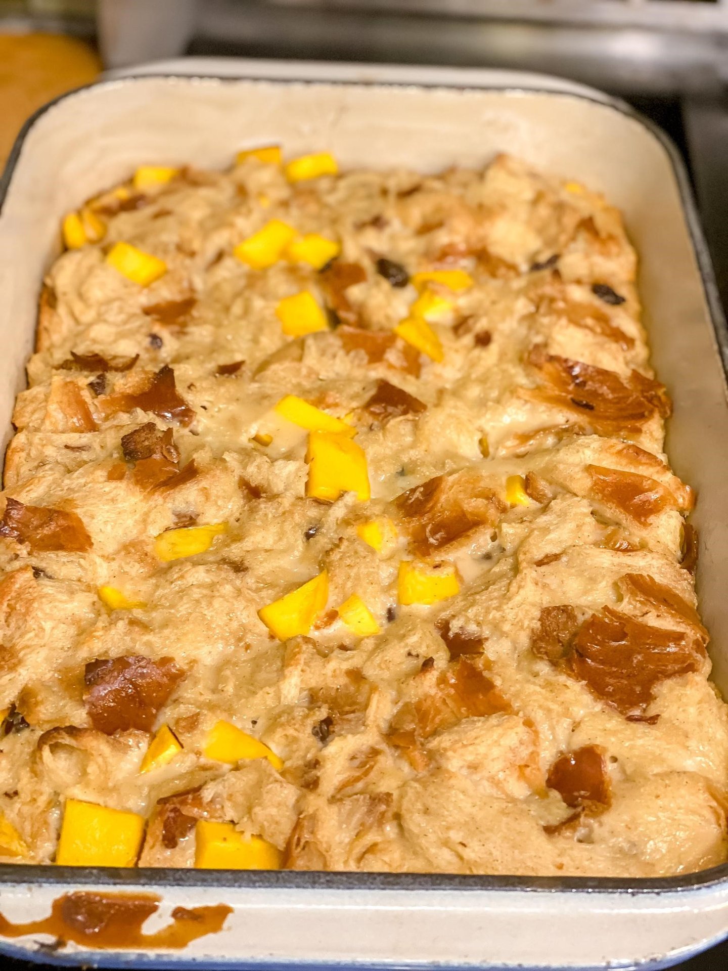 Add the cubed bread to the custard mixture. Fold in the mangos, and allow the bread to absorb the liquid for about 15 minutes.