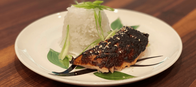 Serve the salmon on a bed of steamed sticky rice, and garnish with sesame seeds and scallions.