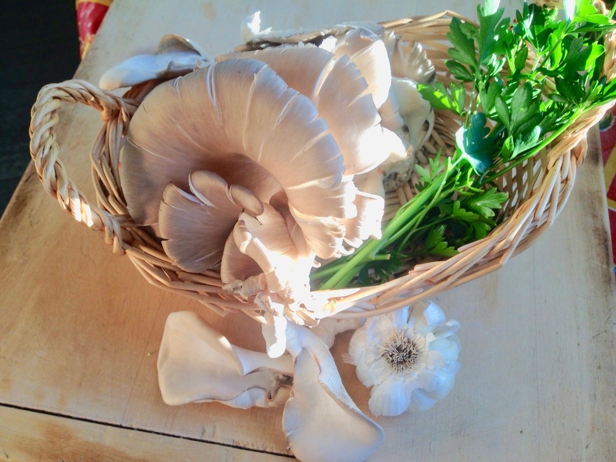 Recently I noticed on the list of offerings that they had a profusion of Snow White and Blue Oyster mushrooms, which I immediately added to my pre-order. When they came, they were so picture-perfect I hardly wanted to eat them. So I took a picture.