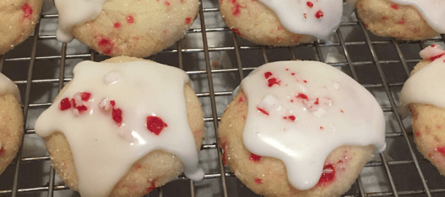 Spoon the glaze on top of each cookie, allowing it to drip down the sides, and top with a sprinkling of the remaining crushed candy canes.