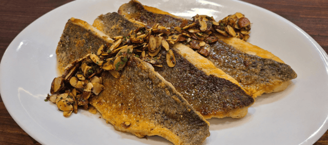 Heat the same pan the trout was cooked in over medium heat, discarding any remaining fat. Add the 4 tablespoons butter, and once the butter has melted, stir in the almonds. Cook until they are lightly toasted, 3 to 4 minutes.