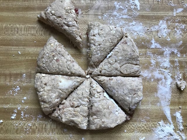 There are a couple of tricks to know about scones. I find that after shaping the dough into a round and freezing it for at least 30 minutes before slicing and going in the oven, I have much better knife cuts for the scones.