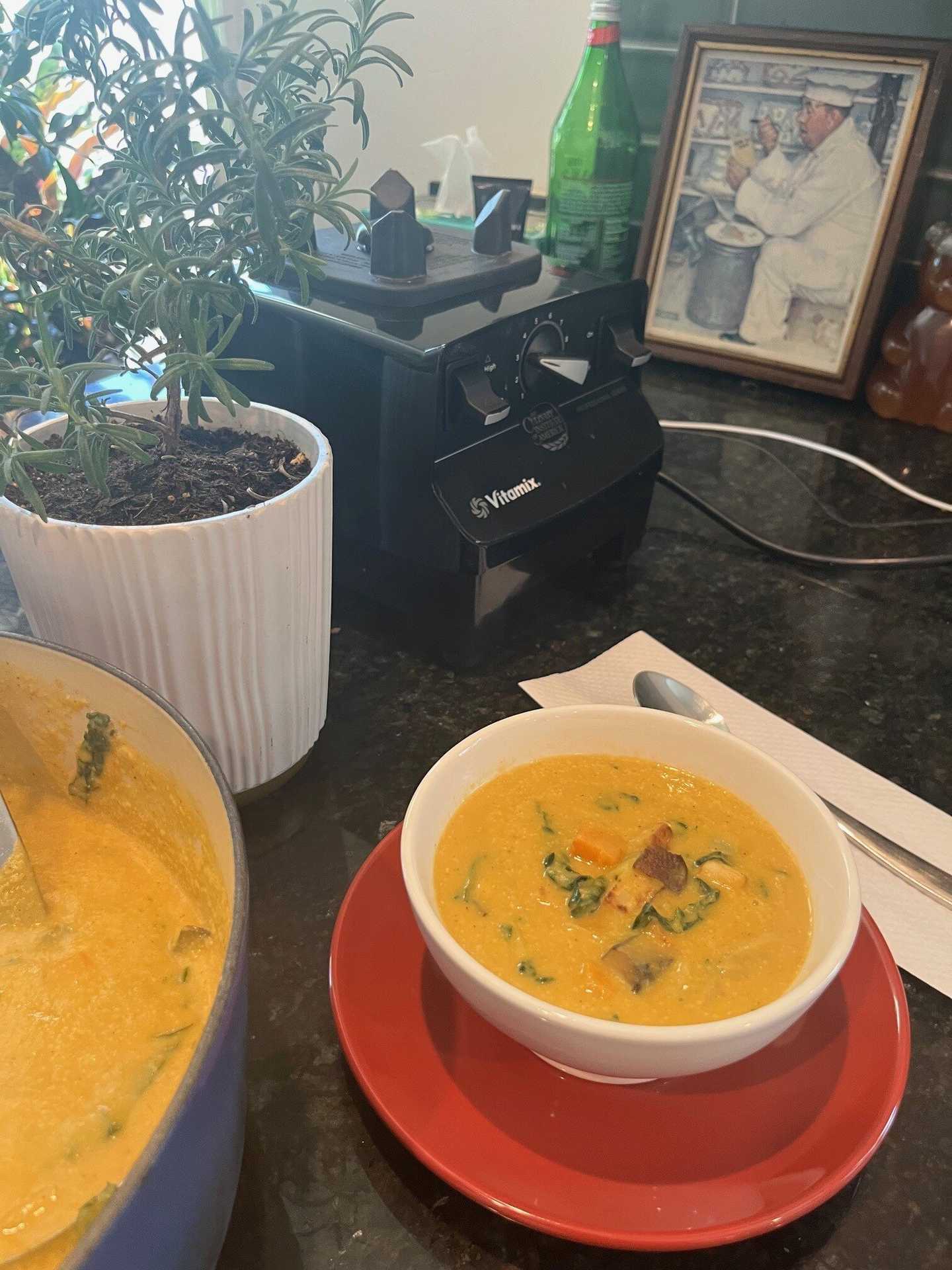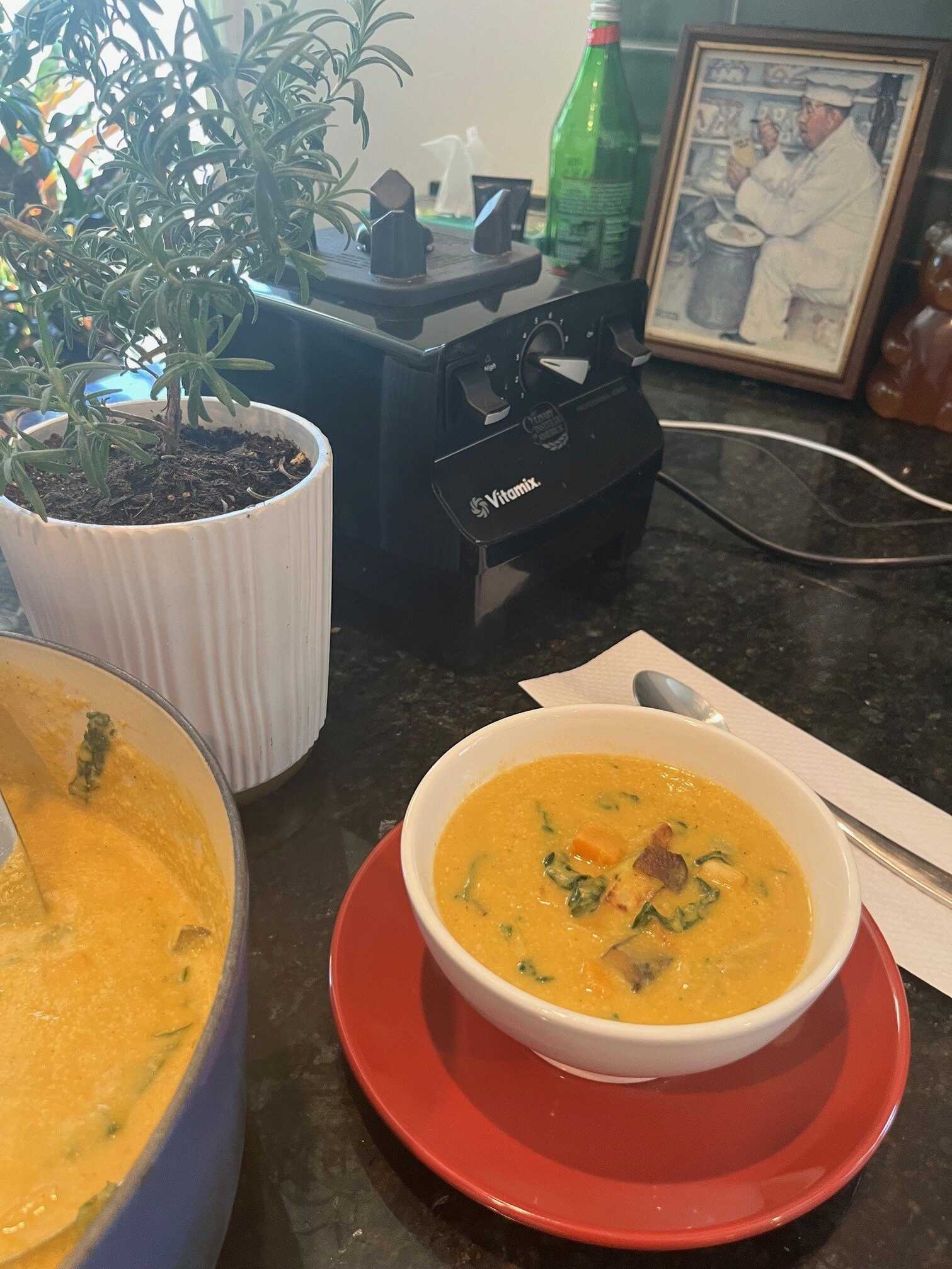 Butternut Squash and Celery Root Soup with Mushrooms, Leeks and Kale