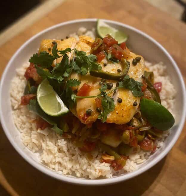 Traditionally, this dish is made with red snapper, but any flaky white fish works. I had some sole on hand, and it turned out great. Cod, halibut, or even tilapia would also be good choices. If fish isn’t your thing, this sauce works just as well with cooked chicken or pork.