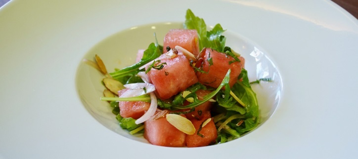 This summer salad combines the sweet fruit of watermelon with peppery green of arugula for a delicious combination with a savory vinaigrette and crunchy nuts.
